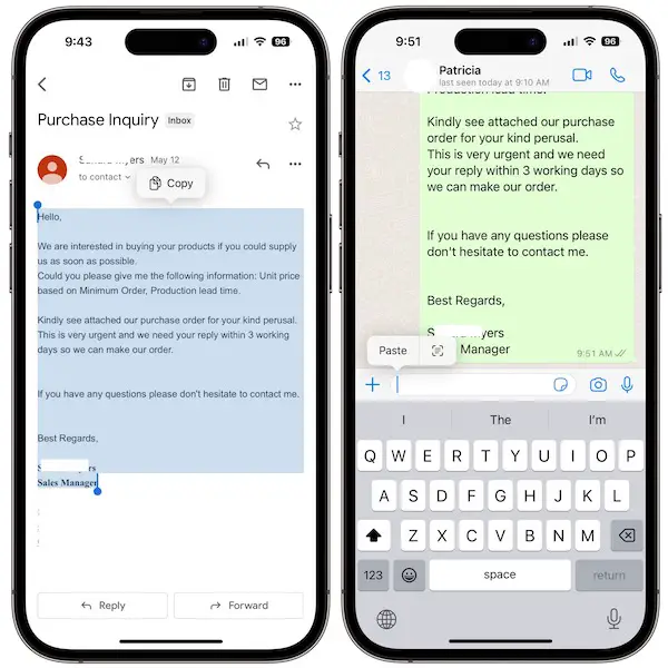 Another way to share an email to WhatsApp is by manually selecting, copying and pasting the entire content from one app to the other: