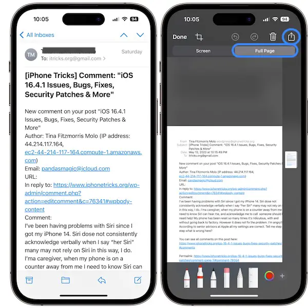 - 2. If you’re using the stock Mail app, you can tap the screenshot thumbnail and use the Full Screen option. This will create an image of the entire email message.
