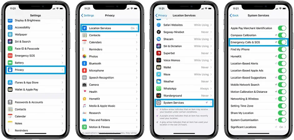 B. If you’re in the U.S. and the feature doesn’t work make sure that your iPhone is set to allow Location Services for the Emgergency Calls & SOS option.