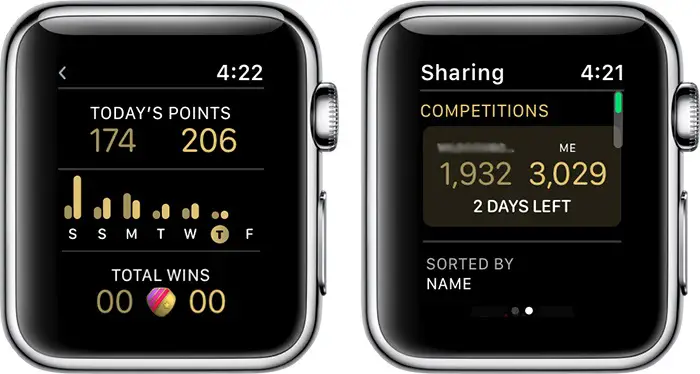 – Competitors receive 1 point for each percent completed in the Stand, Move and Exercise goals. Additional points are added for percentages exceeding your goals. However you can’t earn more than 600 points per day or 4200 points per week. The one that counts the most points at the end of the 7-day period wins the competition!
