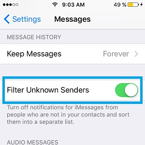Fact: The Filter Unknown Messages option adds two tabs in the Messages Home Screen, the Contacts & SMS column and Unknown Senders column. This way you can easily differentiate between important texts and potential spam.