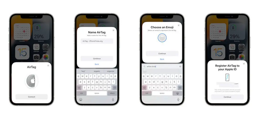 Tip: Use the built-in Emoji Keyboard. The quick search feature is the fastest way around. I recommend you to type ‘white circle’. This way you have an Emoji that resembles the AirTag. It looks like an AirTag Memoji. Doesn’t it? - Confirm that you want to register AirTag to your Apple ID. Tap Continue.