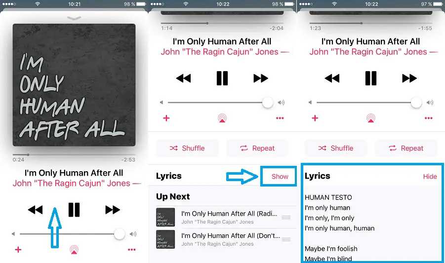 2. Glance Mode Lyrics: If you’re not into party mood and just want to have a brief view of the wordings, you have to swipe up on the Now Playing screen. This action will reveal the hidden Lyrics button. Tap Show, available next to the Lyrics label, and you’ll get a glance of the lyrics. You can scroll back and forth while to song plays. Tap Hide when finished to get back to the normal view. Else, your selection will be remembered and lyrics will be displayed for the upcoming songs too, if you swipe up the Now Playing screen.