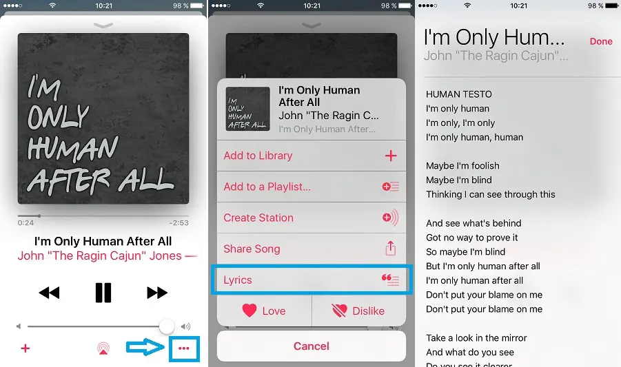 1. Full-Screen Lyrics: Tap the three dots icon, available in the bottom-right corner of the Now Playing screen. This opens up the options menu for the song that’s currently playing. You can add it to your Library, Playlist, create a radio station around this song, share it with your friends and last but not least, unveil the tracks Lyrics. Tap on this newly added option and the rhymes will be displayed full-screen. Now you can start your karaoke session! When finished tap Done and return to the Now Playing screen.