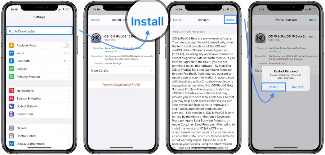 An iOS beta test version is downloaded and installed from Settings, as any other iPhone software update. However, you first need to install the iOS 15 Configuration Profile to get on the Public Beta update stream.