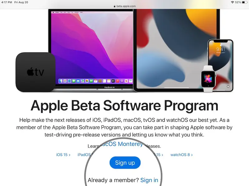 - Tap on beta.apple.com/sp/betaprogram (direct link) to open the Apple Beta Software Program website in Safari on your iPad.