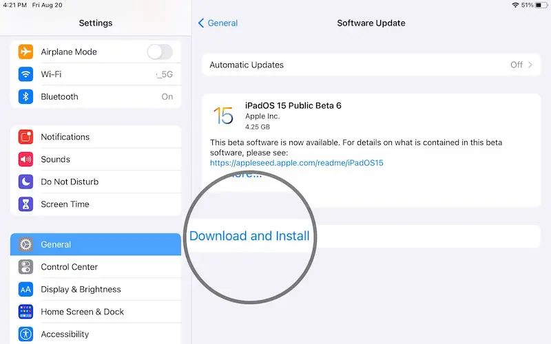 - Tap on Download and Install, after the software update screen prompts you with the iPadOS 15 Public Beta 6 (or any other later version released along the way).