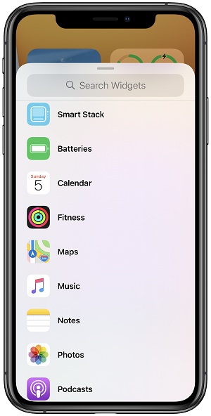The available widgets are: Batteries, Calendar, Fitness, Maps, Music, Notes, Photos, Podcasts, Reminders, Screen Time, Shortcuts, Siri Suggestions, Weather and Smart Stack.