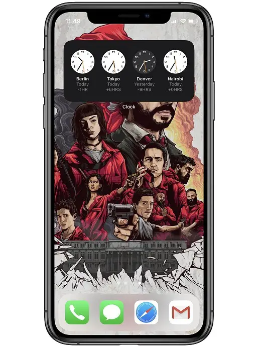 In Money Heist the names of the popular characters have borrowed the names of large cities from the world, to mask their true identities. Pick four of your favorite characters and edit the Clock widget cities to match their names, as shown in the screenshot available nearby!