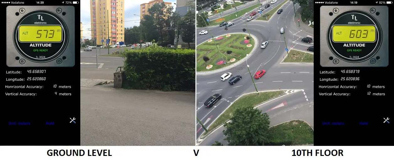 Because iPhones currently calculate altitude via the GPS feature, it was interesting to find out if it can detect altitude changes, even if you are in the same GPS coordinates but climb a few stories higher. So, we decided to take two readings. One from the iPhoneTricks.org office, located at the 10th floor and the second one on ground level right below our office. Check the comparison below and see if the iPhone was able to detect the around 30 meter (100 feet) altitude difference provided by our 10-floor building.