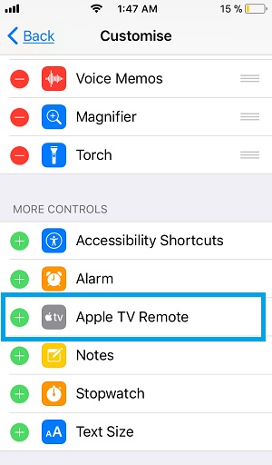 5. In the More Controls list, tap the green + icon next to the Apple TV Remote label. Optionally, drag and drop it to tweak its position in the included controls list.