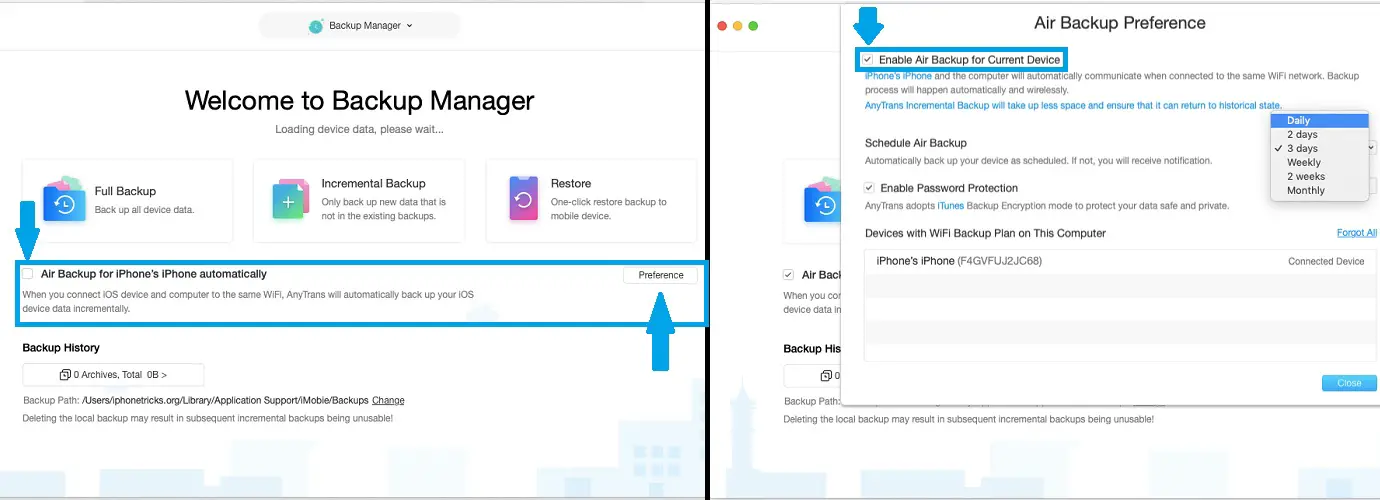 – Now, you have to tick the box next to the “Air Backup for [your name]’s iPhone automatically”. This will allow AnyTrans to backup your iOS device wirelessly when both computer and iPhone / iPad are connected to the same WiFi network.