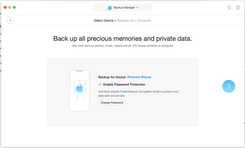 Important: AnyTrans is able to adopt the backup encryption level used with iTunes. So, if you previously configured a backup password on iTunes, the same encryption will be used with your AnyTrans backups. We’re talking about unbreakable AES-256 encryption, via your local SSL-secured Wi-Fi.