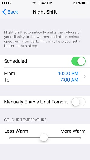 On the same iOS Settings page you can also edit how warm you want Night Shift to make the colors on your iPhone or iPad. There is a knob that you can toggle towards Less Warm, More Warm or leave the default setting in the middle of the two.