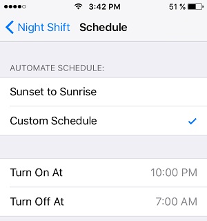 2. Schedule Night Shift Mode by visiting Settings -> Display & Brightness -> Night Shift. Edit the From and To fields by tapping on their label. You can opt for the default schedule Sunset to Sunrise, or personalize it the way you want to.