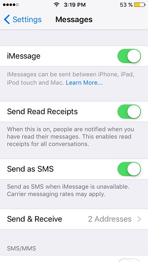 As with iOS 9 and previous versions you have to open Settings and browse to the Messages tab. Then make sure that the iMessage service is enabled and toggle the Send Read Receipts knob ON or OFF. You are informed that this setting activates or deactivates Read status for all conversations.