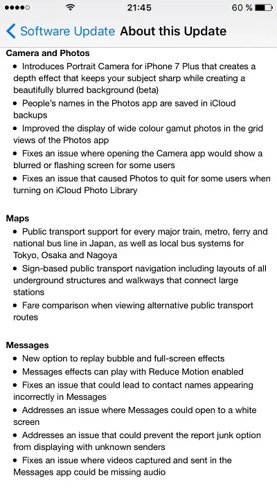 “This update includes Portrait Camera Mode for iPhone 7 Plus (beta), public transport directions for Japan, stability improvements and bug fixes.”