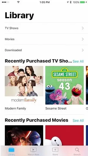 Library comes with three categories: TV Shows, Movies and Downloaded. It also includes the sections Recently Purchases TV Shows and Recently Purchased Movies.