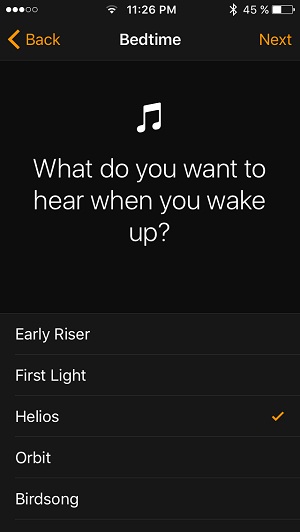 Last but not least, choose the tune that you want to hear when you wake up in the morning. iOS 10 adds some new more gentle tones to make sure that you have a pleasant wake up. Choose between: Early Riser, First Light, Helios, Orbit, Birdsong, Droplets, Sunny and many more songs.