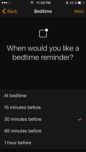 Now it’s time to choose how early you want your iPhone to inform your that sleep time is approaching. If you have a lot of evening habits make sure that you allow yourself enough time to complete them and make your bedtime goal. The default selection is 15 minutes, but that should be quite short for most of us. “30 minutes before” is a more feasible time frame.