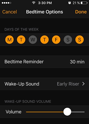 Tap Options, available in the top-left corner to tweak: Days of the Week (when alarms are On), Bedtime Reminder (time buffer), Wake-Up Sound (alarm tone) and Alarm Volume!