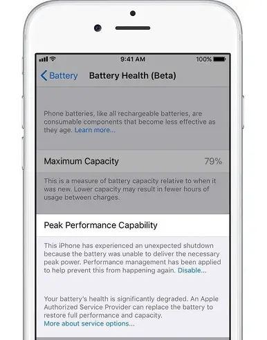 As you know, a battery is a consumable hardware of a smart device. While time passes and your iPhone ages the capacity of its battery to store power also decrease. The “Maximum Capacity” field in the Battery Health screen has the role to inform you about the actual strength of the battery. If the 100% value is displayed it means that the hardware is functioning as new. If the figure is smaller it means that the battery has started to wear out and your device is vulnerable to unexpected shutdowns, because the battery might not be able to cope anymore with the load and provide the peak power needed.