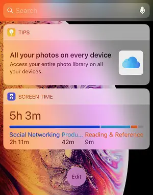 The Screen Time feature is enabled by default when you upgrade to iOS 12 or newer. A quick glance of your daily stats can be done from the Widget-view. Swipe-right on the Lock Screen or Home Screen to bring up your active widgets screen. The Screen Time glance should be available by default. If this isn’t the case you can manually add it by using the Edit button at the bottom of the screen.