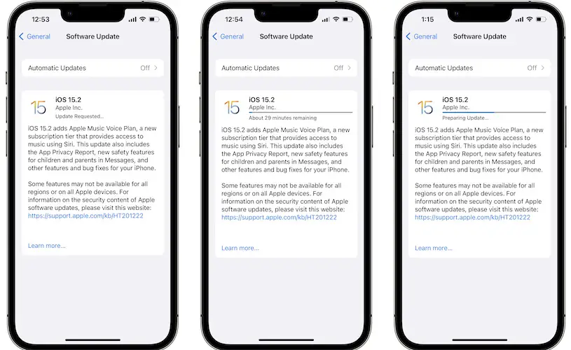 - 3. Be patient until iOS 15.2 is requested, downloaded, prepared, verified and installed on your iPhone.