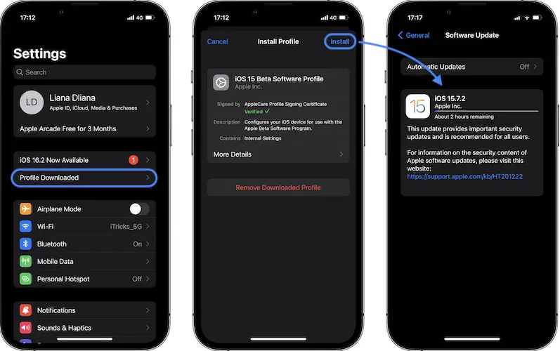 Another option is to download and install the iOS 15 beta profile and update to iOS 15.7.2 RC, over-the-air in Settings: