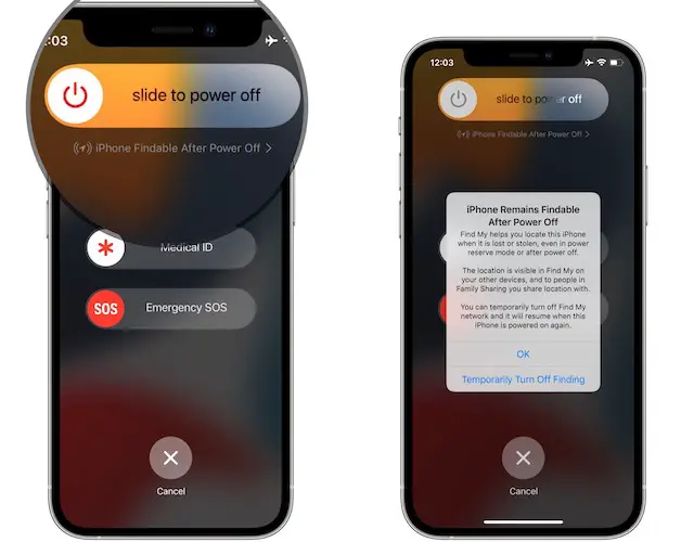 A clickable text that reads iPhone Findable After Power Off is displayed right below the slide to power off section.