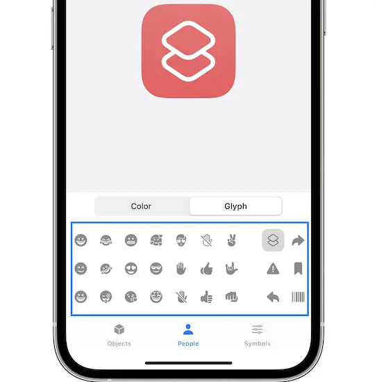-> Tap the Glyph tab and check the new icons organized in Objects, People and Symbols.Fact: There’s still no option o add your own icon from Photos.