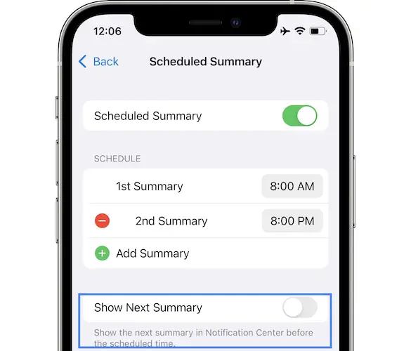A new option allows users to disable the Next Summary in Settings -> Notifications -> Scheduled Summary -> Show Next Summary. -
