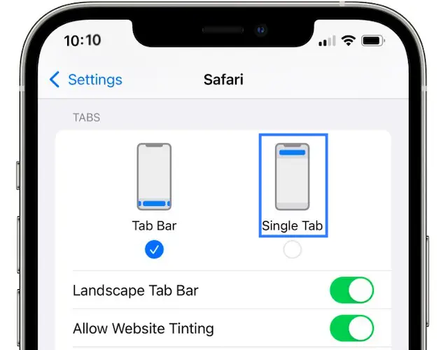 Tip: You can easily switch between Tab Bar and Single Tab view directly while browsing Safari. Just tap the Aa and select Show Top Address Bar or Show Bottom Tab Bar.