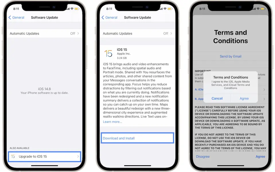 - 1. To update you need to browse for Settings -> General -> Software Update -> Upgrade to iOS 15.