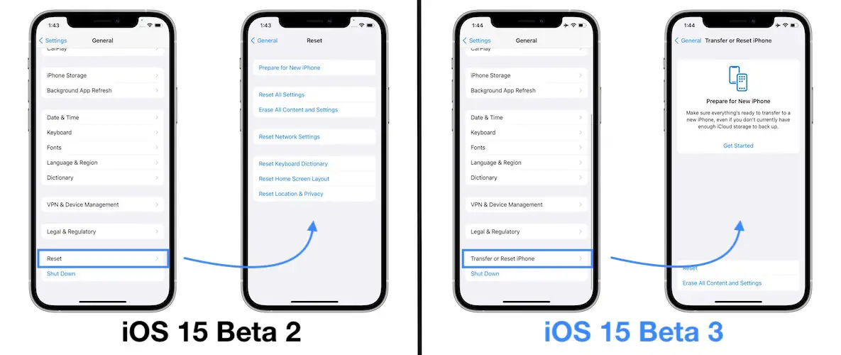 The former Reset option available in Settings -> General has been renamed to Transfer or Reset iPhone.
