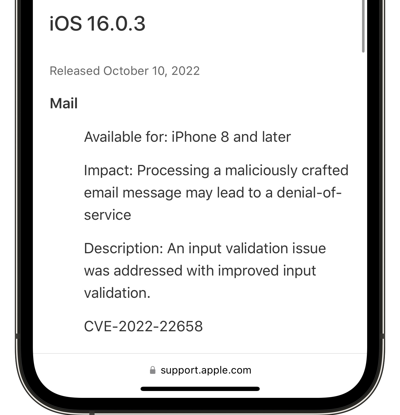 The security content confirms a Mail app patch that prevents maliciously crafted email message to cause denial-of-service. More details available here.