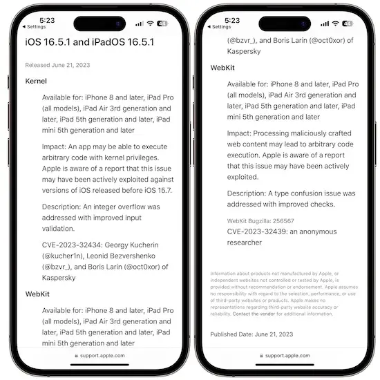 Apple confirms in the update log that this release brings important security enhancements. Two patches are mentioned in the security document:
