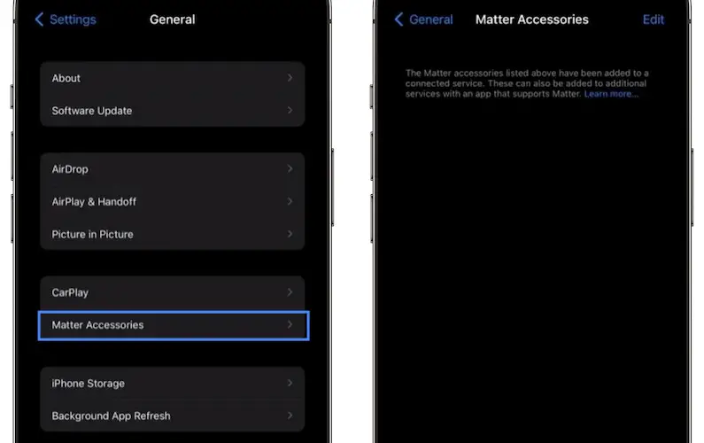 - 2. Matter Accessories option in Settings -> General, below CarPlay and above iPhone Storage.
