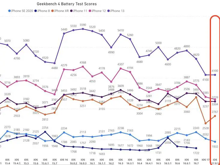 Fact: The Geekbench 4 battery speed tests graph confirms that iOS 17 and iOS 17.0.1 are battery hogs for most iPhone models.