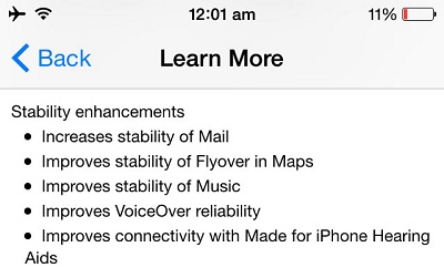 This update adds a series of stability improvements which include Mail, Flyover in Maps, Music, VoiceOver reliability, Hearing Aids connectivity.