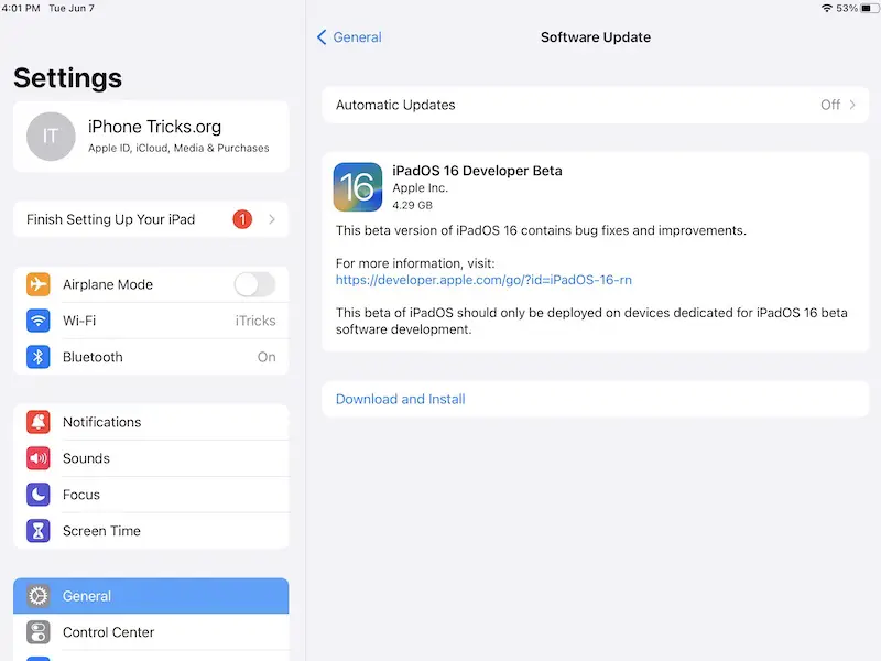 - 4. Tap Download and Install on the iPadOS 16 Developer Beta page. Type Passcode and be patient until the update is requested, downloaded and prepared for update.