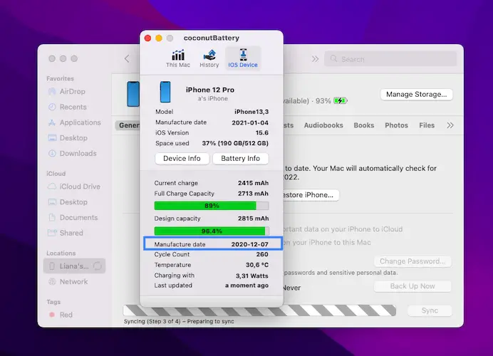 - Tap iOS Devices and iPhone 12 Manufacturing Date is listed right above Cycle Count.