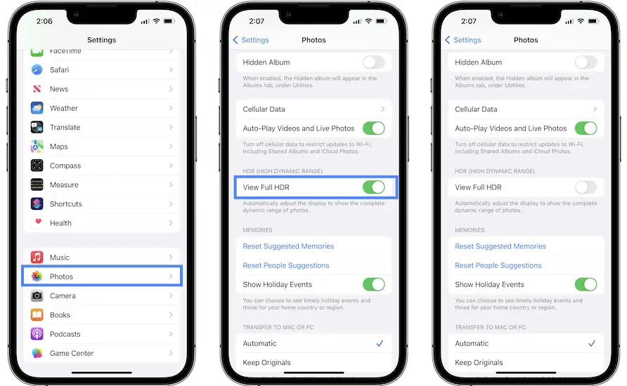 Some users have complained that pictures display blurry in the Photos app. Apparently, this can be fixed by disabling the ‘View Full HDR’ setting. This option is used to allow the iPhone display to show the complete dynamic range of photos.