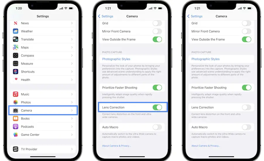 Another setting that can cause iPhone 13 low quality photos is Lens Correction. It’s role is to correct lens distortion for the front and ultra wide cameras. If it glitches out it might cause the blurry photos issue.