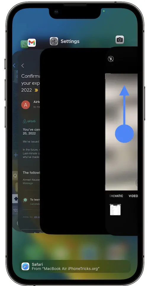 - Swipe-up on the Camera app card to force close it.