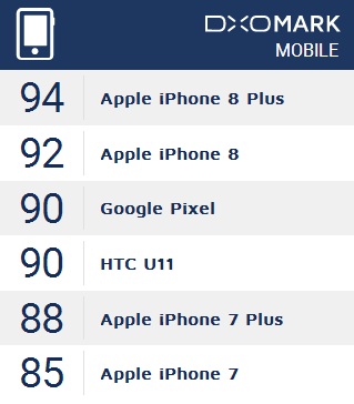 Today, the renown DxOMark camera ratings have been updated with the reviews of the iPhone 8 Plus and iPhone 8 cameras. The results place Apple’s flagship at the top of the chart, ahead of the Google Pixel and HTC U11 devices, that previously managed to top last year’s iPhone 7 & iPhone 7 Plus lineup. The dual-camera iPhone 8 Plus scores 94 points, just 2 units higher than his smaller sibling. It seems that the sensor improvements and new features like Portrait Lightning gave the iPhone 8 line a strong enough bump to top the rankings!