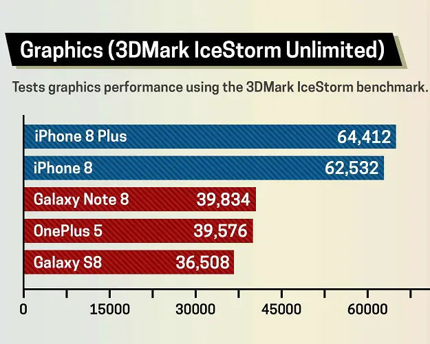 But that’s not all, according to tomsguide.com, Geekbench 4 isn’t the only benchmark that confirms the huge superiority of the A11 Bionic chip. According to the image uploaded nearby, the 3D Mark IceStorm Unlimited graphics benchmark shows a huge difference between the iPhone 8 Plus, iPhone 8 and the rest of the pack Galaxy Note 8, OnePlus 5 and Samsung Galaxy S8. The performance gab is obvious when the same 2 minute 4k video clip is exported and saved. The iPhone 8 managed to complete the task in an impressive time of 42 seconds while, while the Galaxy Note 8 needed 3 minutes and 3 seconds, while the Galaxy S8+ required 4 minutes and 7 seconds.