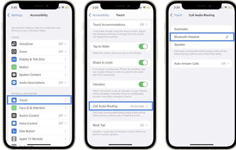 How to: Browse for Settings -> Accessibility -> Touch -> Call Audio Routing. Select Bluetooth Headset.