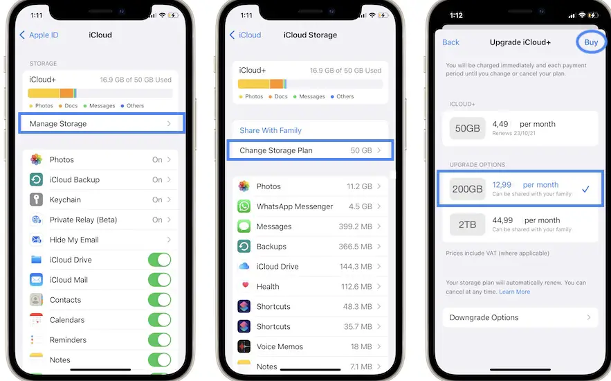 - Settings -> Apple ID -> iCloud -> Manage Storage -> Change Storage Plan.
