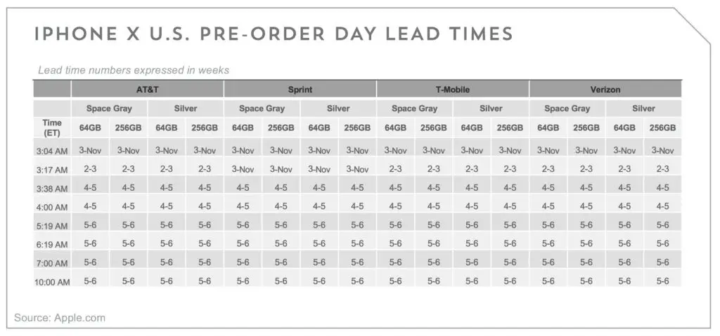 A former Apple analyst has accurately illustrated the way shipping times jumped during the early iPhone X pre-order stages. Take a look at the diagram available nearby and see that only 16 minutes into the pre-sales, all available iPhone ‘Tens’ for launch day delivery, were already booked and shipping estimates jumped to 2-3 weeks. 17 more minutes later, the delivery time jumped again to 4-5 weeks for all available U.S. carriers. 2 hours and 18 minutes since the start of the iPhone X pre-order campaign estimates went one more level up to 5-6 weeks.
